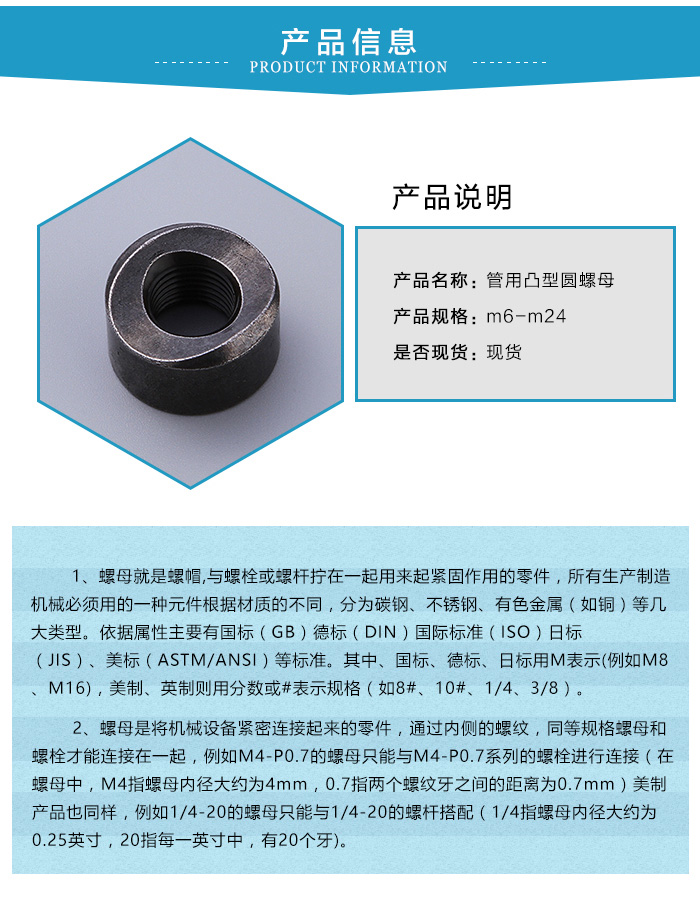 管用凸型圓螺母可以說是在我們的生活中隨處可見,當(dāng)然在一定程度上說明我們的生活與其息息相關(guān),也體現(xiàn)了管用凸型圓螺母的重要程度,因此對(duì)管用凸型圓螺母的要求可是額外重要。管用凸型圓螺母有四大材質(zhì):碳鋼、不銹鋼、銅質(zhì)、合金。碳鋼材質(zhì)的管用凸型圓螺母可以說是不叫大眾化,也是用量z多的一種,呈黑色狀,整體較為堅(jiān)硬,不銹鋼材質(zhì)的管用凸型圓螺母,則多是運(yùn)用在一些電子行業(yè)、船舶工業(yè)、汽車行業(yè)等,因其不易生銹的原因,運(yùn)用的領(lǐng)域算是不叫了,銅質(zhì)管用凸型圓螺母可以說是專用于煤礦、電力等需要防爆的領(lǐng)域,合金鋼材質(zhì)因非常的堅(jiān)硬耐用,在鐵路交通、采礦設(shè)備、石油鉆井則是廣泛使用的一種。