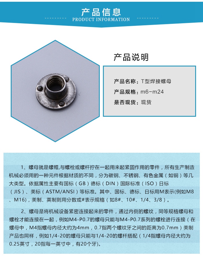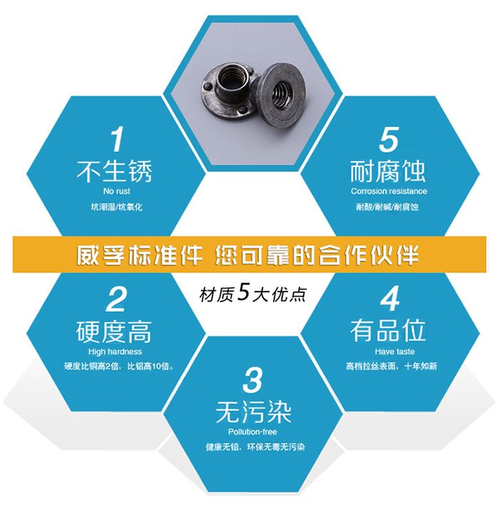 T型焊接螺母,強(qiáng)度比較大,且使用范圍廣,薄厚都可以,但是由于高溫會(huì)導(dǎo)致被連接件變形,且不可拆卸,而且一些活潑金屬不能用通常方法焊接,比如鋁,鎂等,需要保護(hù)氣或氬弧焊,要求加工工藝和精度。