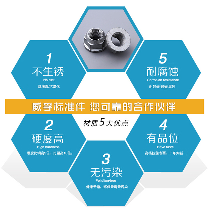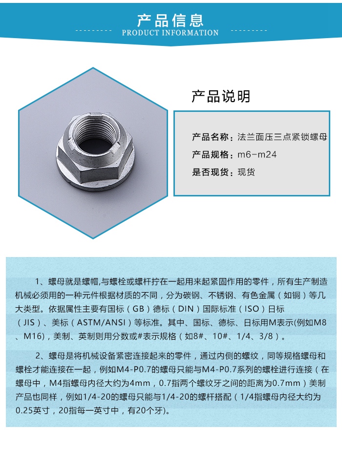主要規(guī)格:M5 M6 M8 M10 M12 M16 M20 (M20以上規(guī)格和M14 M18的法蘭WF002法蘭面壓三點(diǎn)緊鎖螺母多不常用)