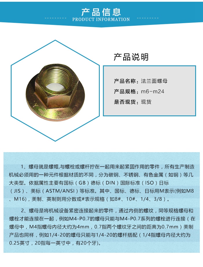法蘭螺母也稱帶墊螺母,花齒螺母,六角法蘭面尼龍墊圈鎖緊螺母,法蘭螺帽等。大多用在管道連接或者需要增加螺母接觸面的工件上。一般常見的法蘭螺母規(guī)格大致都在M20以下,因為大部分法蘭螺母都是用在管道及法蘭盤上,所以受工件約束,法蘭螺母規(guī)格同螺母相比比較少一些。M20以上的一些法蘭螺母大多為平面法蘭,就是法蘭面上沒有齒紋,這些螺母大部分用在一些特殊設(shè)備和特殊地方。